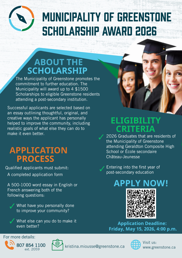 The Municipality of Greenstone is excited to announce applications are now being accepted for the 2026 Municipality of Greenstone Scholarship Awards. The Municipality will award up to four $1500 Scholarships to Greenstone residents attending a post-secondary institution. Successful applicants are selected based on an essay outlining thoughtful, original, and creative ways the applicant has personally helped to improve the community, including realistic goals of what else they can do to make it even better.